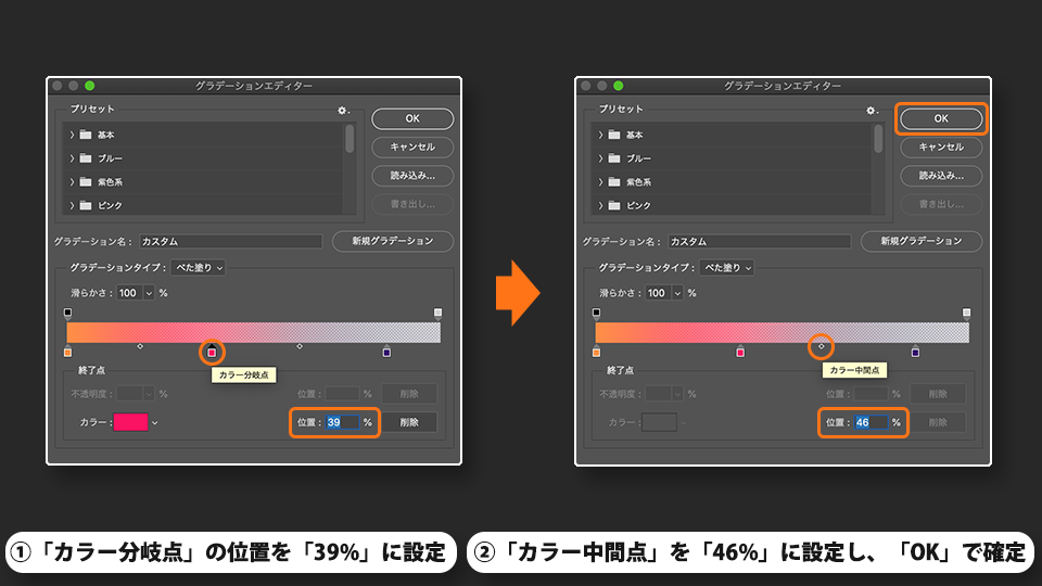 紫とピンクの間の「カラー中間点」を「46%」に設定し、「OK」をクリックして確定します。