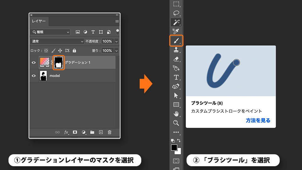 レイヤーパネルでグラデーションレイヤーのマスクを選択し、ツールパネルで「ブラシツール」を選択します。