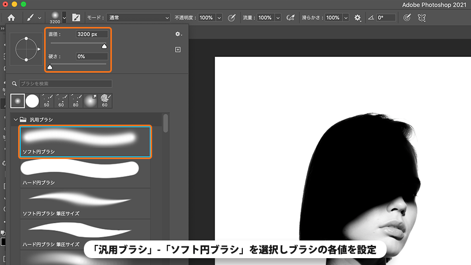 オプションバーで「汎用ブラシ」-「ソフト円ブラシ」を選択し、ブラシを以下に設定します。