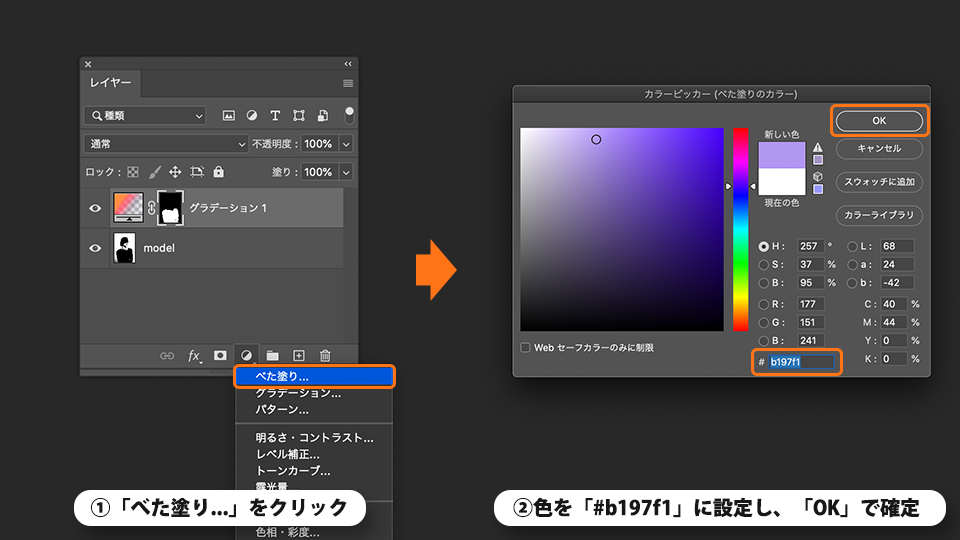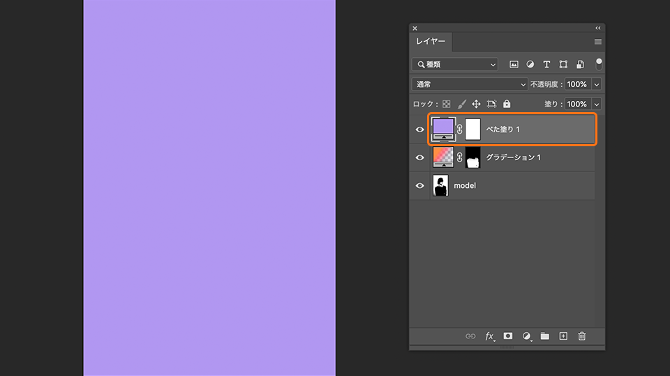 レイヤーパネル下部の「塗りつぶしまたは調整レイヤーを新規作成」-「べた塗り...」を選択します。