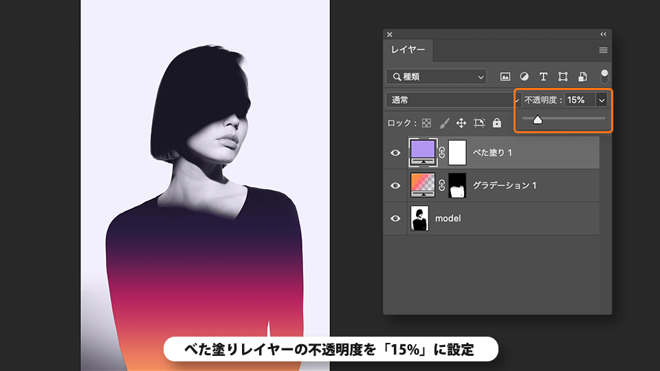 レイヤーパネルでべた塗りレイヤーの不透明度を「15%」に設定します。