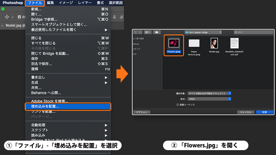 メニューバーから「ファイル」-「埋め込みを配置」を選択し、「Flowers.jpg」を選択して「配置」をクリックします。
