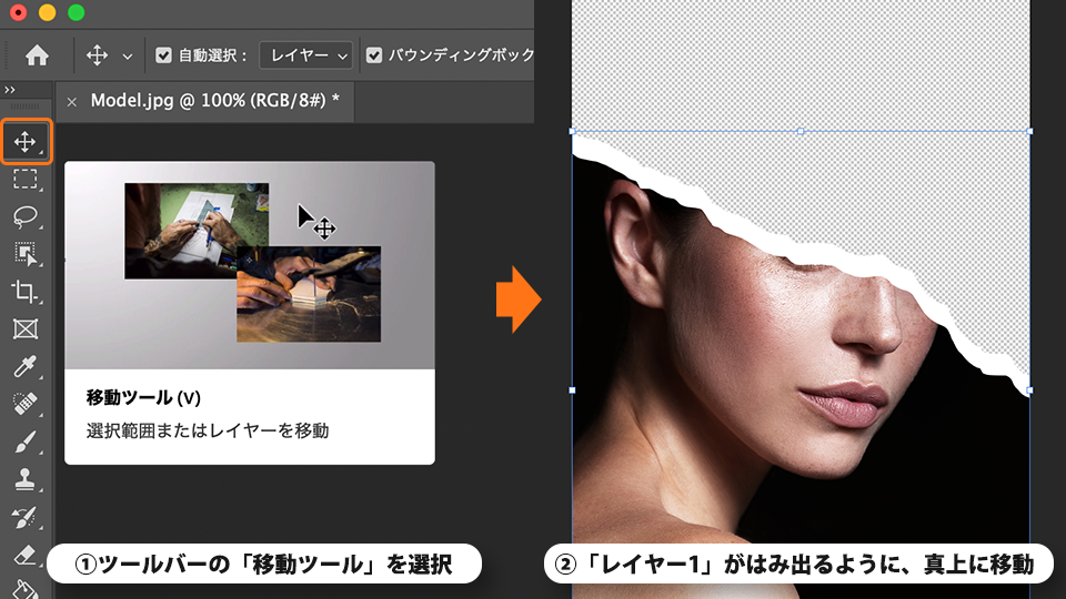 ツールバーで「移動ツール」を選択し、「レイヤー1」を「Model」レイヤーから少しはみ出るように、真上に移動します。