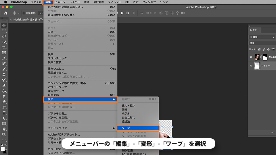 メニューバーから「編集」-「変形」-「ワープ」を選択します。