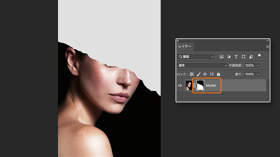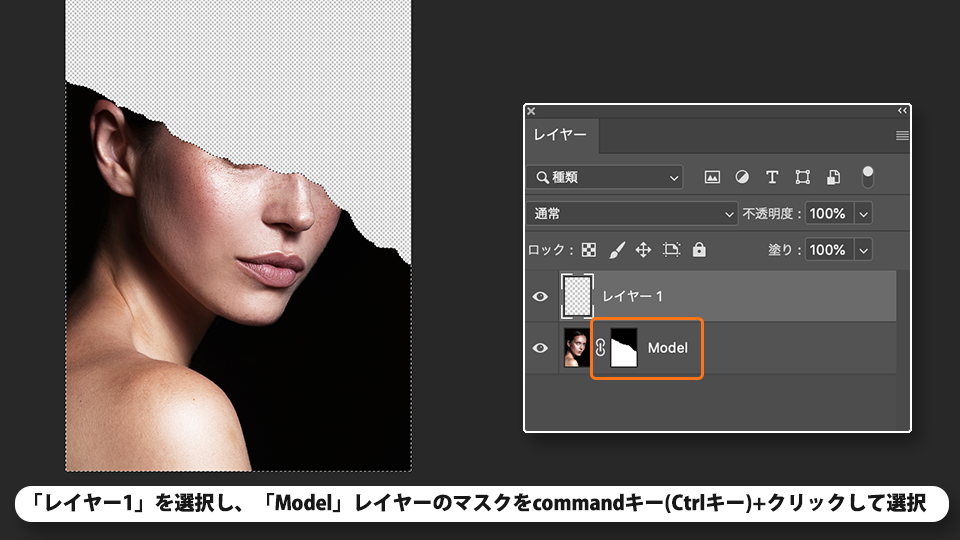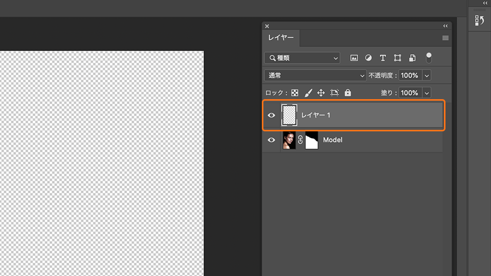 「レイヤー1」を選択した状態で「Model」レイヤーのマスクをcommandキー+クリック(Windowsの場合はCtrlキー+クリック)して選択します。