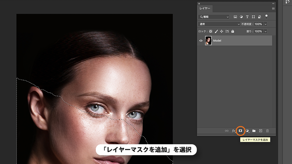 レイヤーパネル下部の「レイヤーマスクを追加」を選択し、選択範囲外をマスクします。