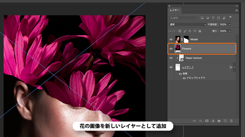 このチュートリアルでは、Adobe Photoshopを使用して、モデルの画像と花の画像を重ねて雰囲気のある作品を作成するテクニックを説明します。「なげなわツール」とテクスチャ画像で、モデルの顔の画像を引き裂いたような効果を加えて、人目をひく魅力的なギミックを作品にほどこします。まずは下の一分動画を確認して、操作を開始しましょう。