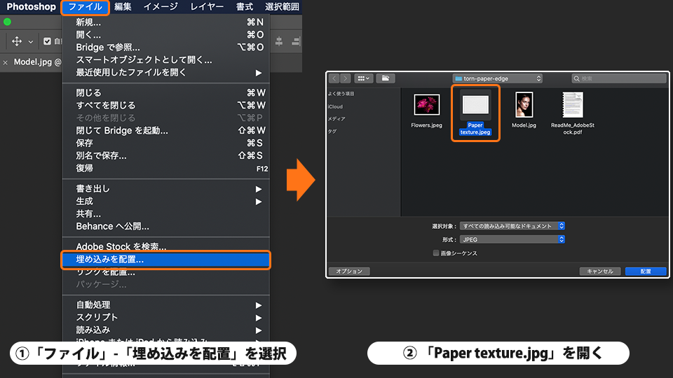 メニューバーから「ファイル」-「埋め込みを配置」を選択し、「Paper texture.jpg」を選択して「配置」をクリックします。