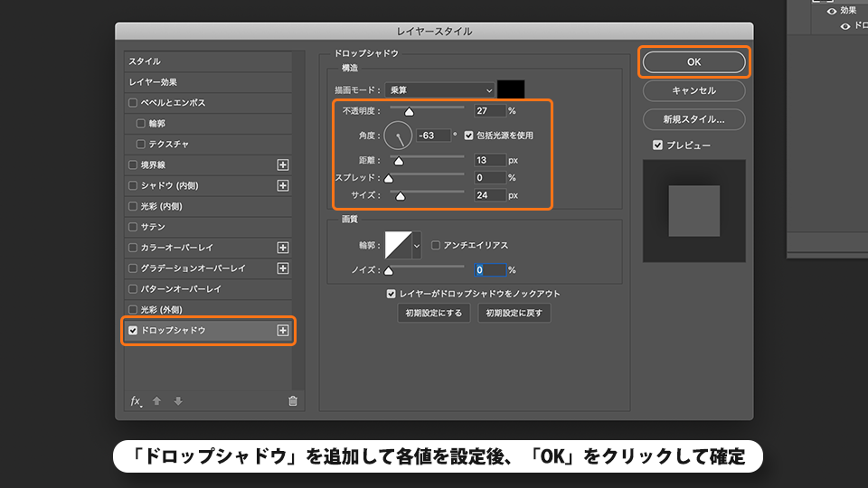 レイヤーパネルで「レイヤー1」をダブルクリックして「レイヤースタイル」ダイアログボックスを表示します。