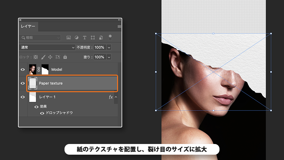 テクスチャのレイヤーを画像の裂け目が覆われるサイズに拡大します。