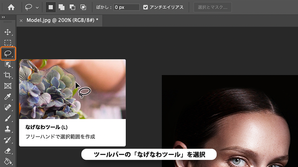 Photoshopを起動し、メニューバーの「ファイル」-「開く」から練習用サンプルファイル「Model.jpg」を選択して開きます。