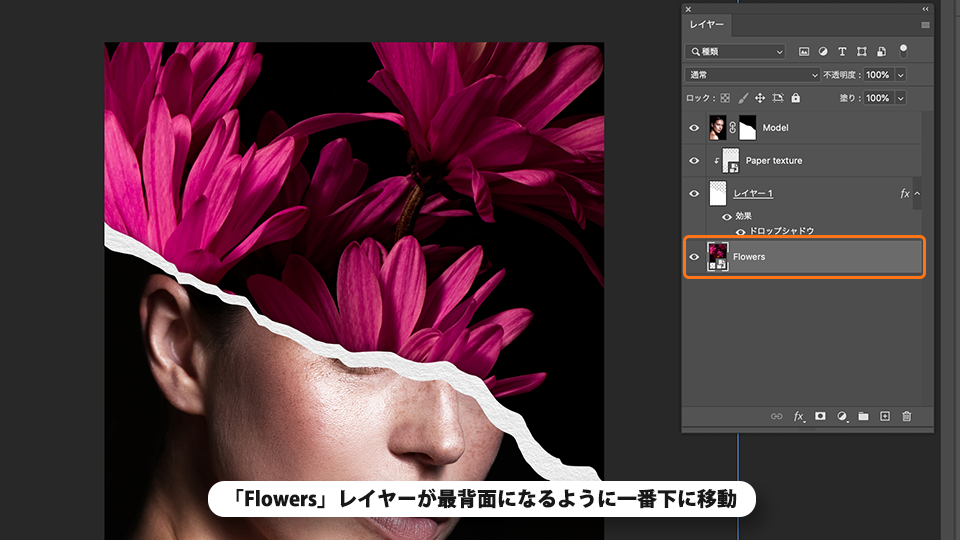 「Flowers」レイヤーが最背面になるようにレイヤーパネルで「Flowers」レイヤーを一番下に移動します。