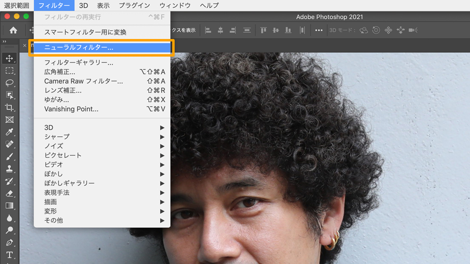 ファイルが開いたら「フィルター」→「ニューラルフィルター」をクリックします。