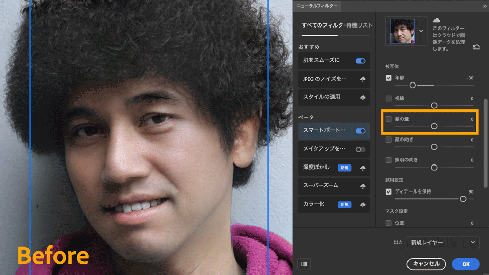「被写体」>「髪の量」のスライダーを右に「+30」まで動かします。⼈物の髪の量が増えます。左⽅向に動かすと髪の量が減ります。