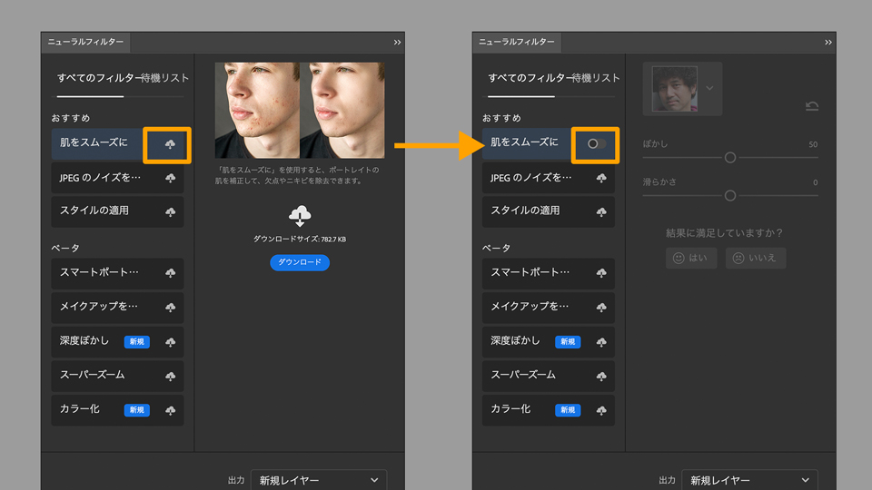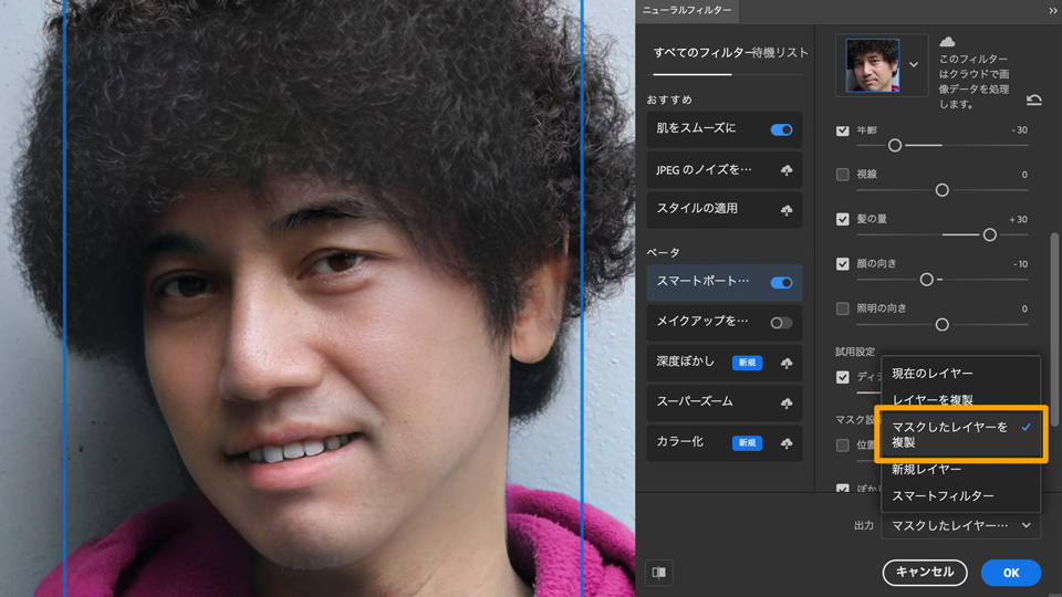 スマートフィルター :スマートフィルターの新規レイヤーとして出⼒されます。