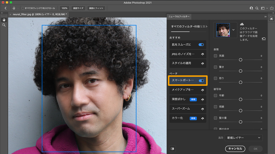 続いて、ニューラルフィルターパネルから「ベータ」→「スマートポートレイト」をオンにします。(最初に使⽤する場合はフィルターをダウンロードします)