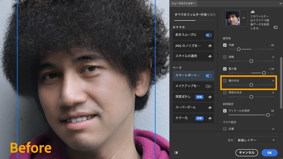 「被写体」>「年齢」のスライダーを左に「-30」まで動かします。⼈物の年齢が若返ります。右⽅向に動かすと年齢が増します。