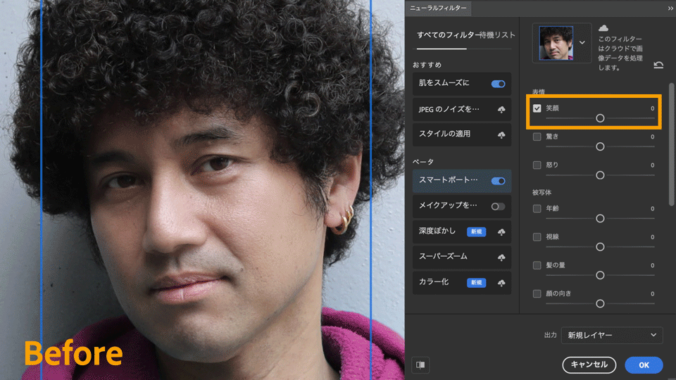 スマートポートレイトは、顔の表情や年齢、髪量、向きなどを個別に変更できるフィルターです。順番にいくつか試していきましょう。
