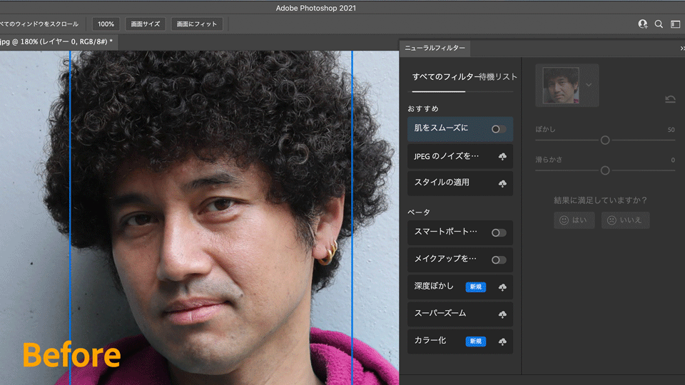 このフィルターは、顔のしわ、しみ、にきびなどを⼀瞬で修正し、滑らかな肌に仕上がります。必要に応じて、右側のスライダーでぼかしや滑らかさを調整してみましょう。