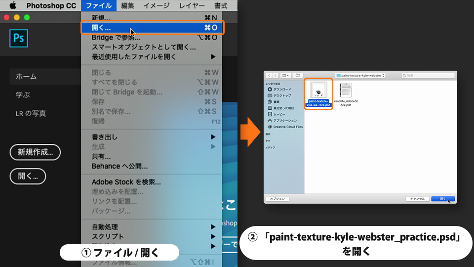 Photoshopを起動し、「ファイル」-「開く」から練習用サンプルファイル「paint-texture-kyle-webster_practice.psd」を選択して開きます。