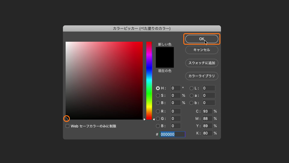 「カラーピッカー(べた塗りのカラー)」で、黒を選択して、「OK」をクリックします。