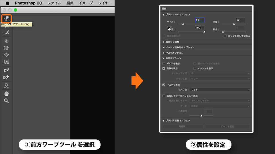 「前方ワープツール」を選択し、属性を以下の通りに設定します。 サイズ:63
