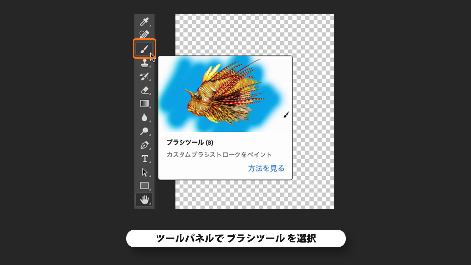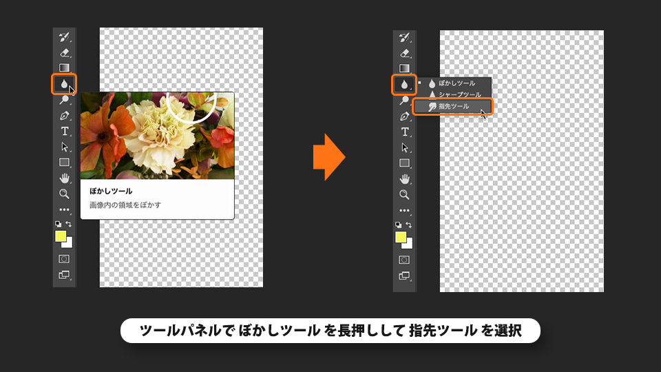 ツールパネルで「ぼかしツール」を長押しして、「指先ツール」を選択します。