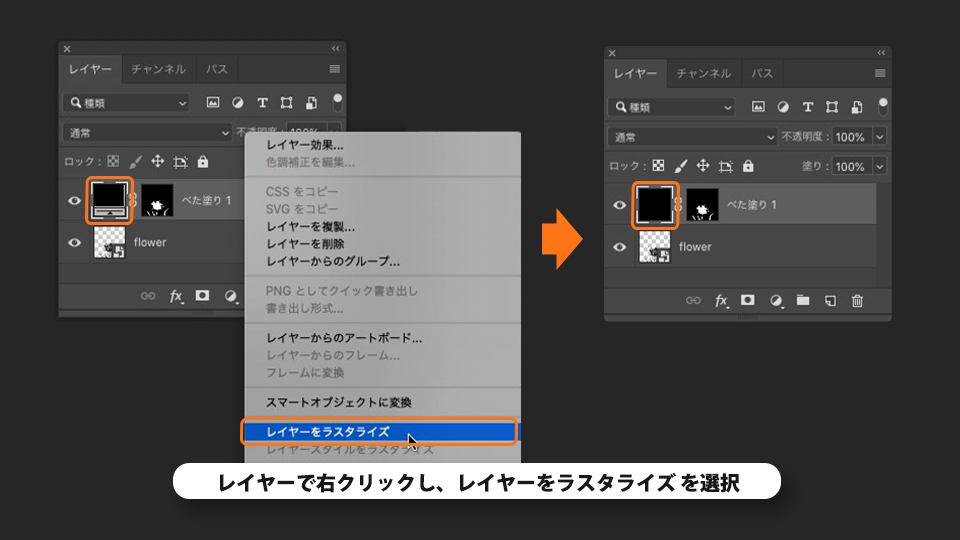レイヤーで右クリックし、「レイヤーをラスタライズ」を選択します。