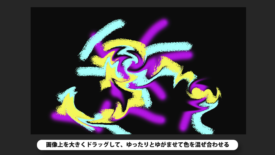 「前方ワープツール」で画像上を大きくドラッグして、ゆったりとゆがませて色を混ぜ合わせていきます。