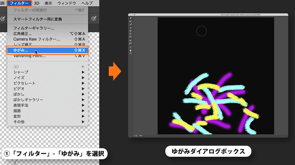 「フィルター」-「ゆがみ」を選択して「ゆがみ」ダイアログボックスを開きます。