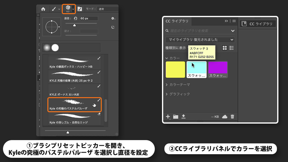 ブラシプリセットピッカーを開き、「Kyle の究極のパステルパルーザ」を選択し、直径とカラーを以下のように設定します。