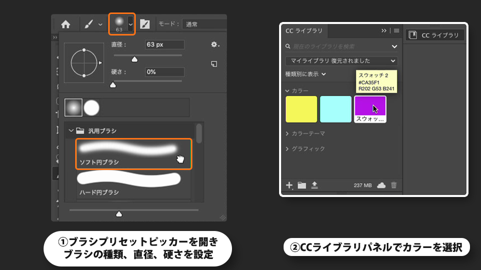 操作画面の左上にあるオプションバーでブラシプリセットピッカーを開き、「汎用ブラシ」から「ソフト円ブラシ」を選択し、直径と硬さ、カラーを以下のように設定します。