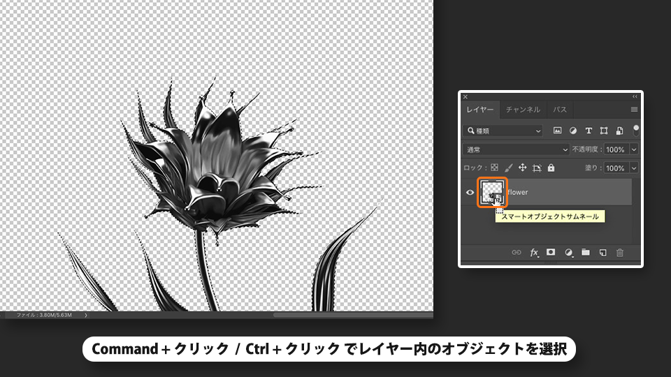 レイヤーパネルで、Command + クリック(macOSの場合)/Ctrl + クリック(Windowsの場合)し、花のアートのみを選択します。