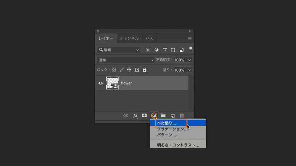 レイヤーパネル下部で、「塗りつぶしまたは調整レイヤーを新規作成」をクリックし、「べた塗り」を選択します。