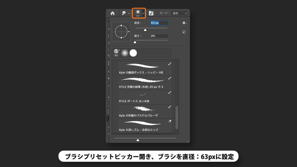 オプションバーでブラシプリセットピッカー開き、ブラシを以下のように設定します。 直径:63px