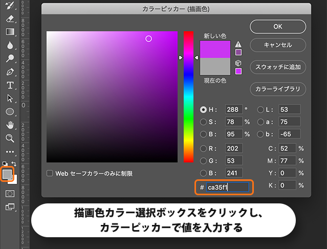 CCライブラリパネルを使用しない場合は、ツールパネルで「描画色カラー選択ボックス」をクリックしてカラーピッカーを開きます。