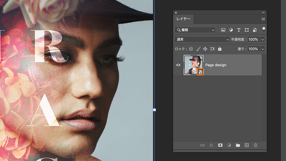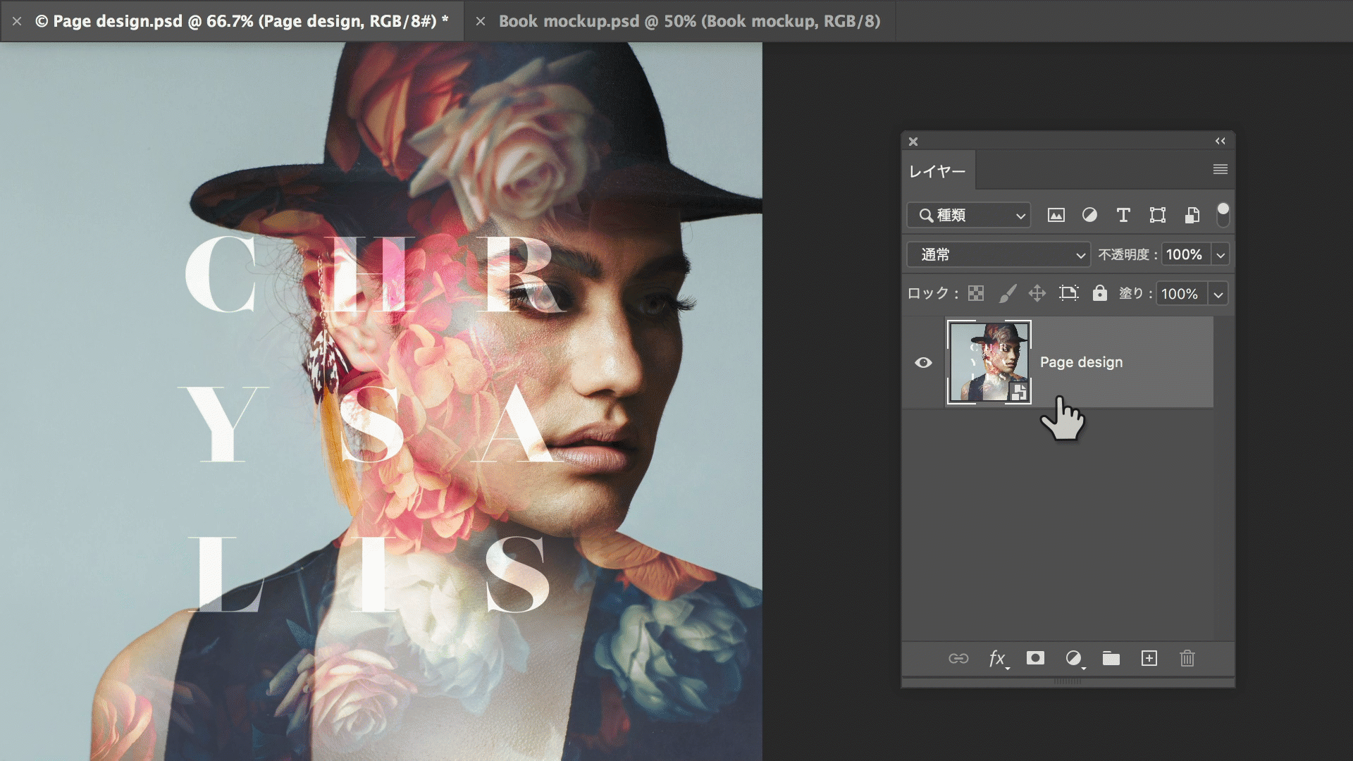 「Page-design.psd」のデザインレイヤーを「Book mockup.psd」の本のレイヤー上にドラッ グします。