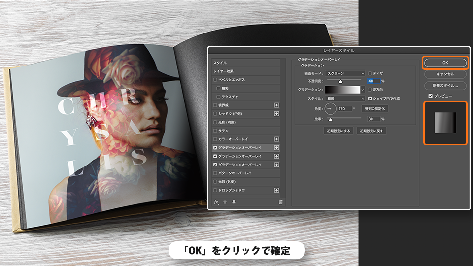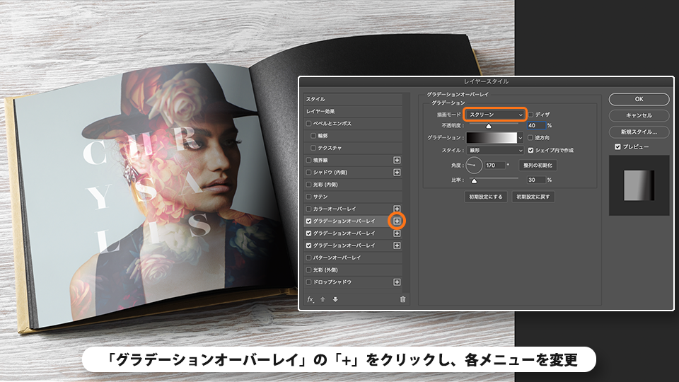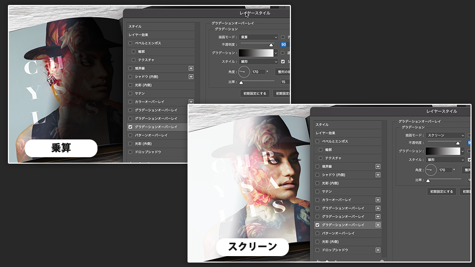 3 回目のグラデーションオーバーレイでは描画モードを「スクリーン」に設定しました。