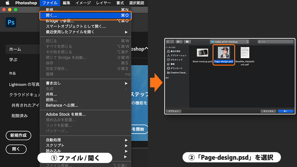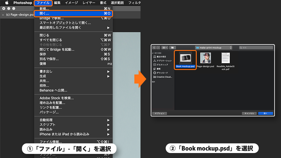 「ファイル」-「開く」から練習用サンプルファイル「Book mockup.psd」を選択して開きます。