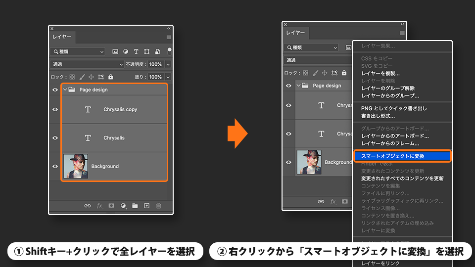 テキストレイヤーと背景画像をスマートオブジェクトに変換します。