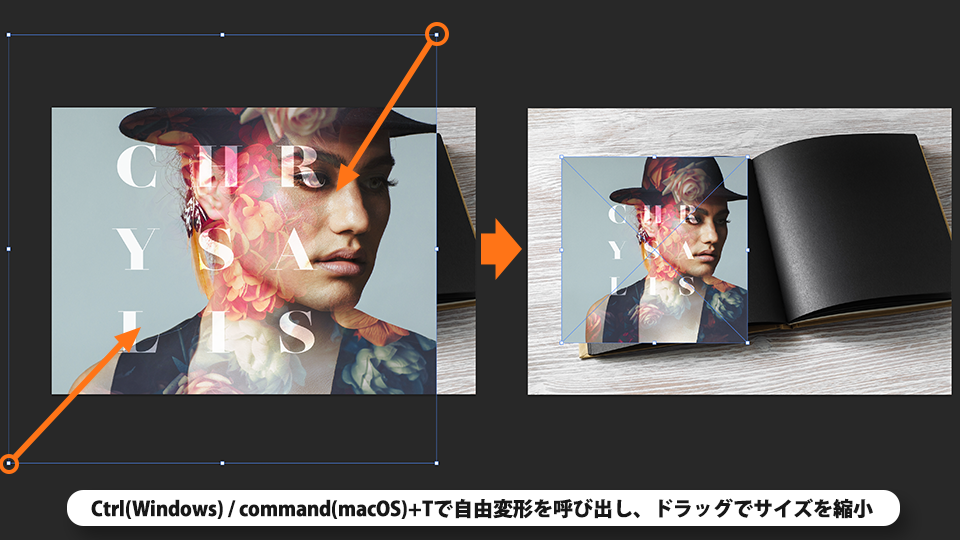Ctrl(Windows) / command(macOS)+T で自由変形ツールを呼び出します。