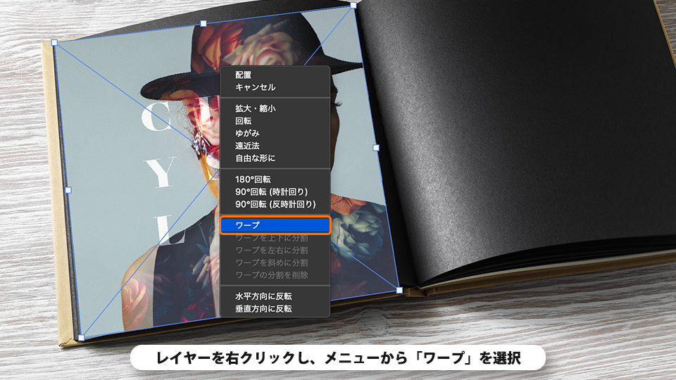 レイヤーを右クリックし、メニューから「ワープ」を選択します。
