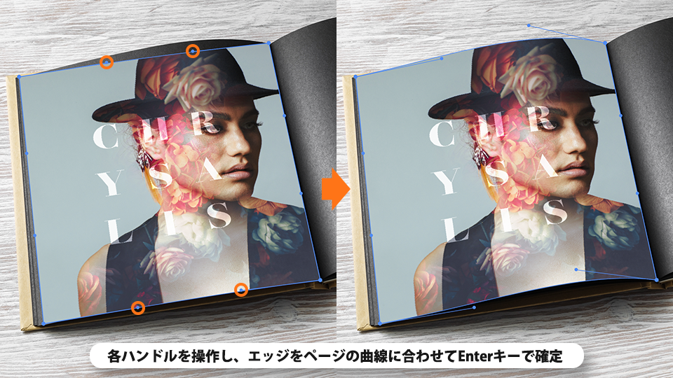 各ハンドルを操作し、エッジをページの曲線に合わせて Enter キーで確定します。