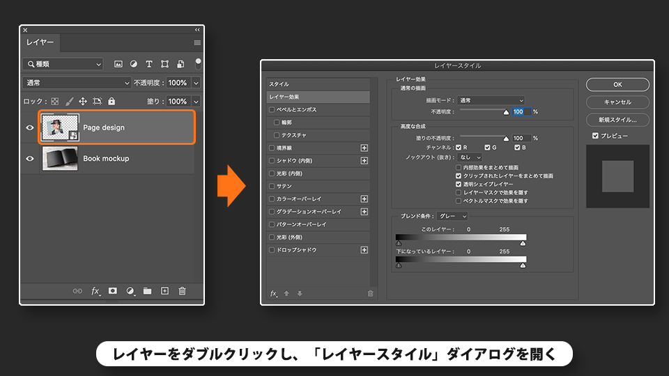 Page Design レイヤーをダブルクリックし、「レイヤースタイル」ダイアログボックスを開きます。