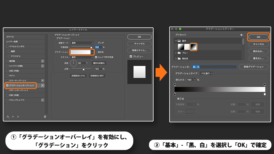 プリセットから「基本」-「黒、白」を選択し「OK」で確定します。