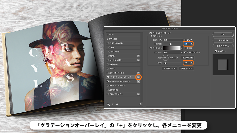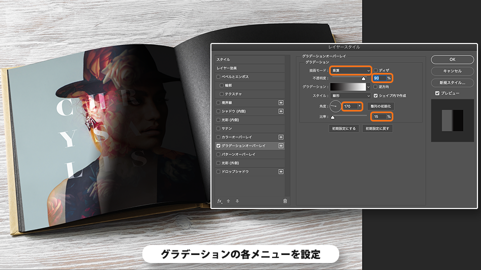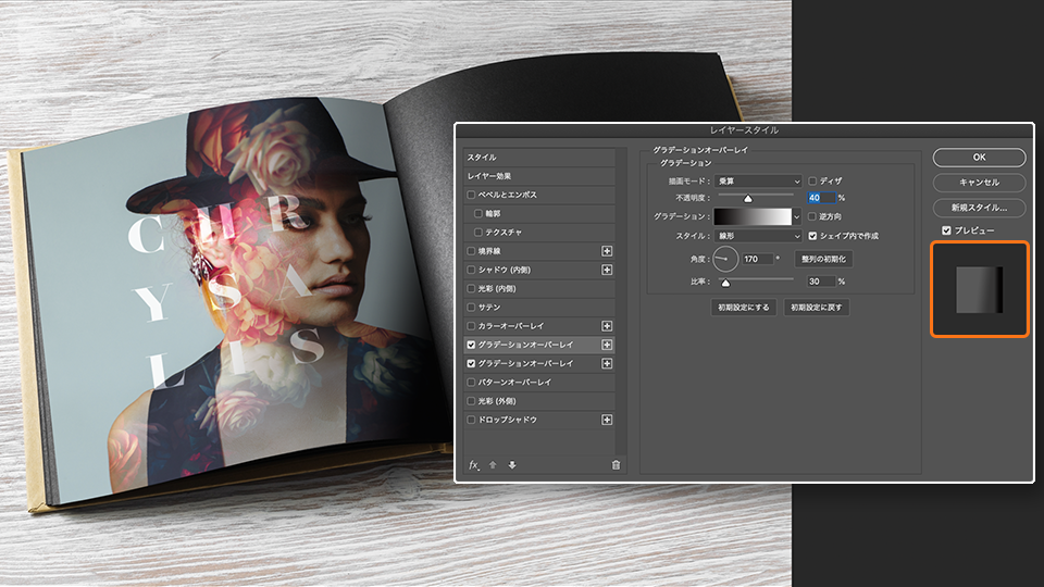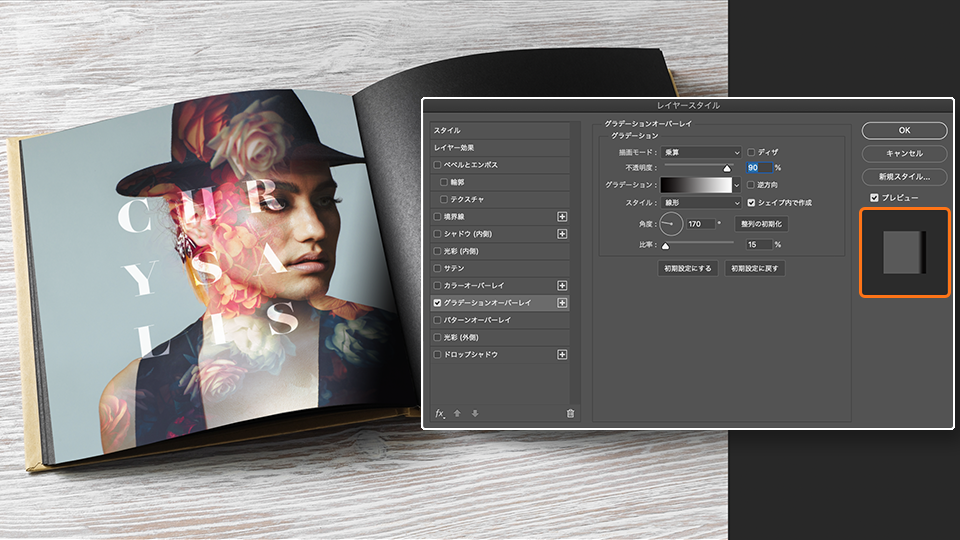 ページのノド(綴じ目)が暗くなるように、レイヤーにグラデーションを重ね掛けします。