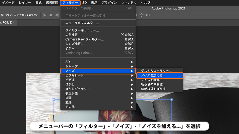 メニューバーの「フィルター」-「ノイズ」-「ノイズを加える...」を選択します。