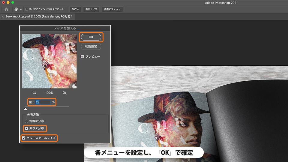 このチュートリアルでは、Adobe Photoshop を使用して、デザイン画像と本の写真からモックアップページを作成する方法を紹介します。グラデーションを重ね掛けして陰影を加え、さらにノイズでざらつきを与えることで、実際の紙面のような質感に仕上げます。