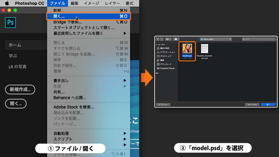 Photoshopを起動し、「ファイル」-「開く」から練習用サンプルファイル「model.psd」を選択して開きます。