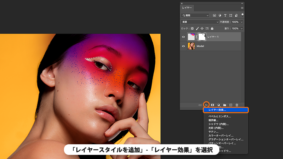 レイヤーパネル下部の「レイヤースタイルを追加」-「レイヤー効果」を選択します。